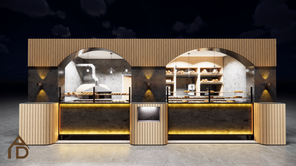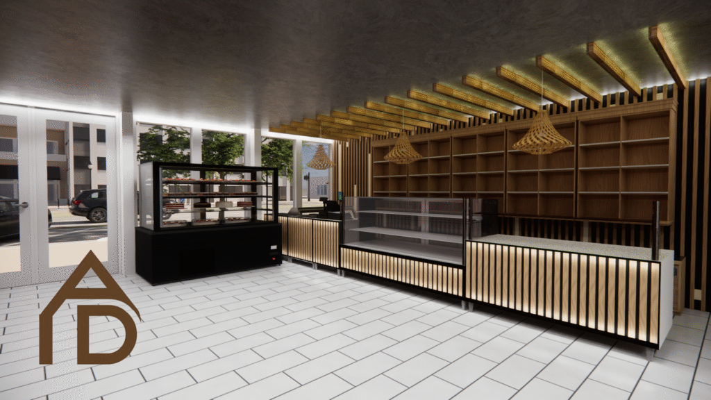 In this modern bakery project, we focused on our client’s demand for a space that is both inviting and operationally efficient. To create a bright and warm atmosphere, we combined the natural texture of light wood panels with modern track lighting and the clean lines of the service counter.