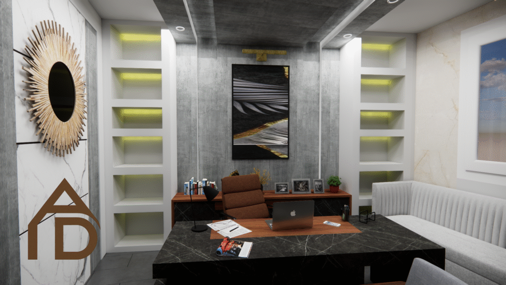In this executive office project, we focused on our client’s demand for a workspace that is both prestigious and highly functional. To create a modern and powerful atmosphere, we balanced cold textures like marble and raw concrete with integrated illuminated shelving and warm wood details.