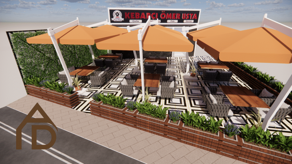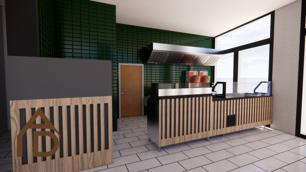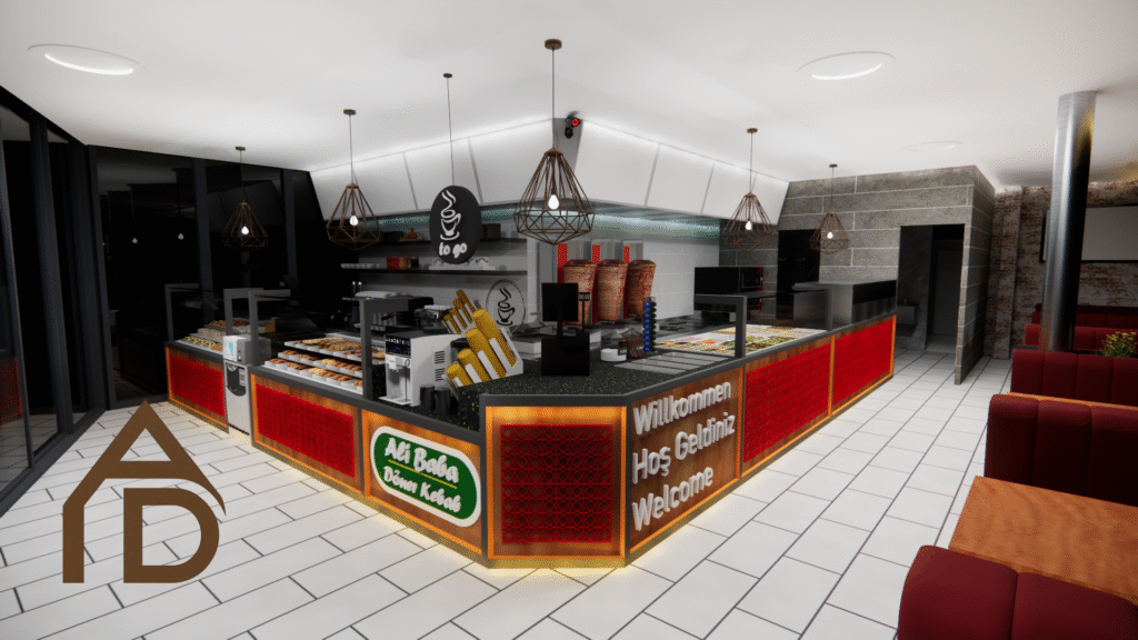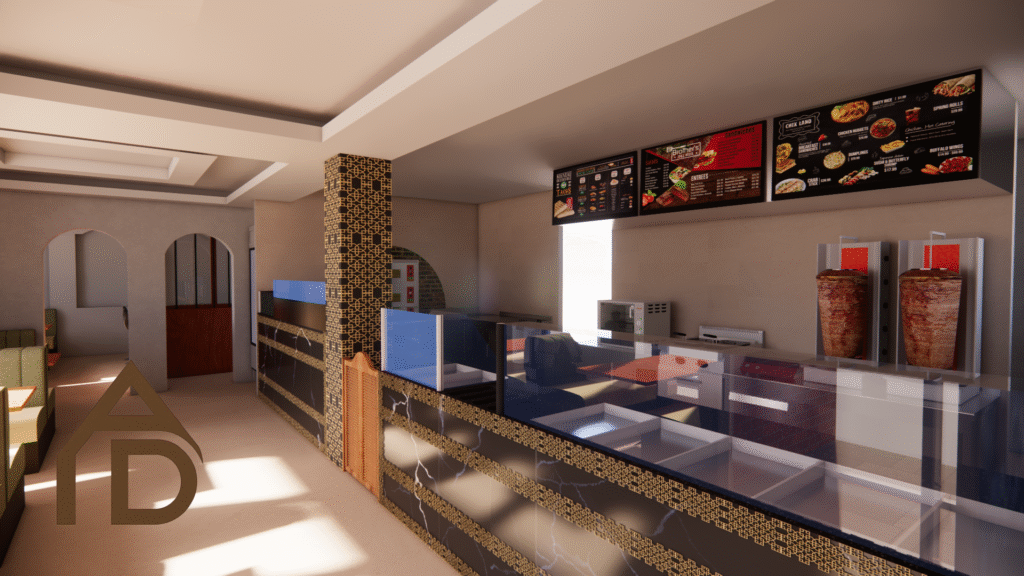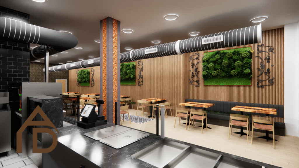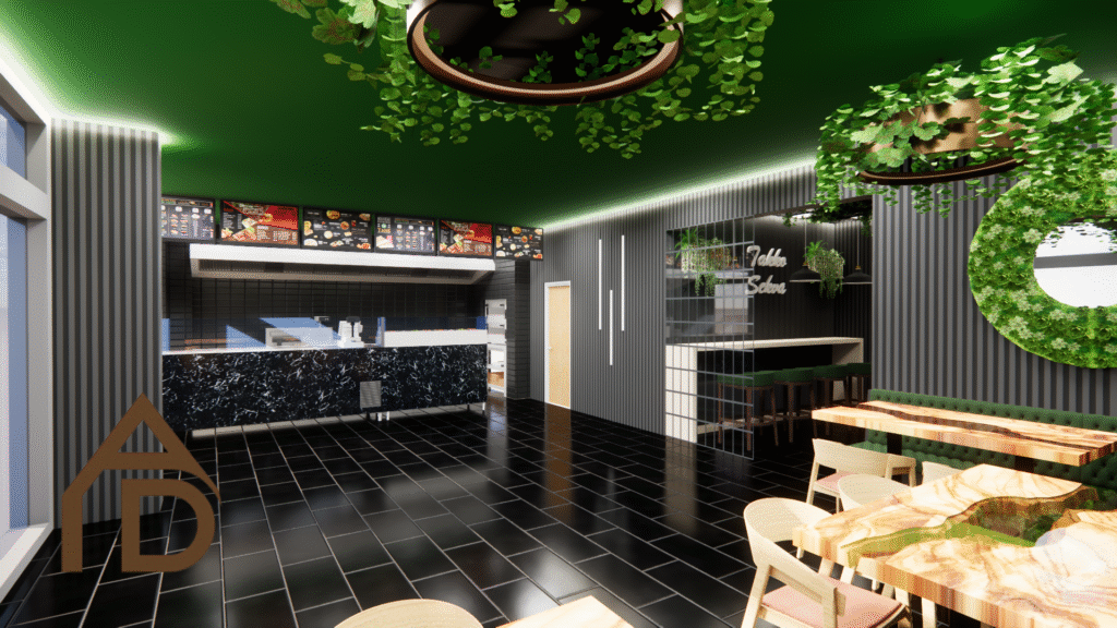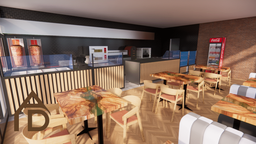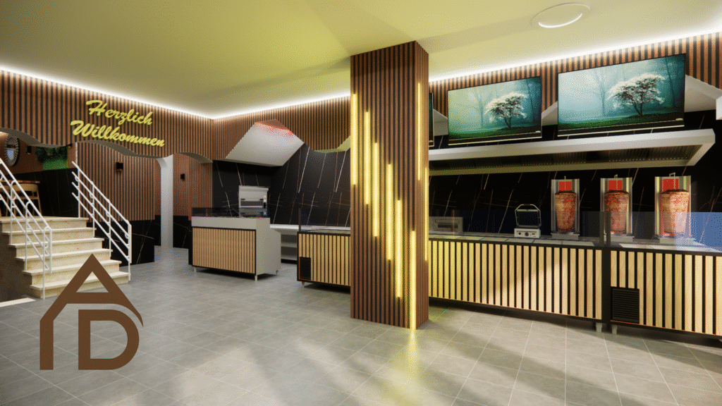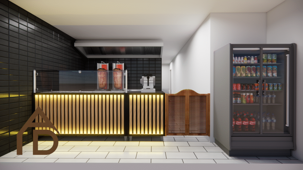 In this modern kebab concept project, we focused on our client’s demand for a space that is both inviting and operationally efficient. To create a warm and stylish atmosphere, we combined the natural texture of the vertical wood panels on the service counter with modern lighting solutions and the clean lines of the black tiles in the background.