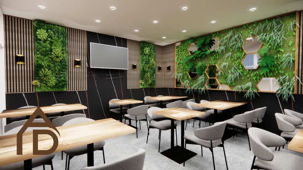 In this modern restaurant project, we focused on our client’s request for a space that is both inviting and connected with nature. To create a sophisticated yet fresh atmosphere, we combined the dominant wood and black marble textures with striking vertical gardens. Our selection of contemporary lighting fixtures and comfortable, elegant furniture aims to provide a chic and relaxing dining experience for all guests.