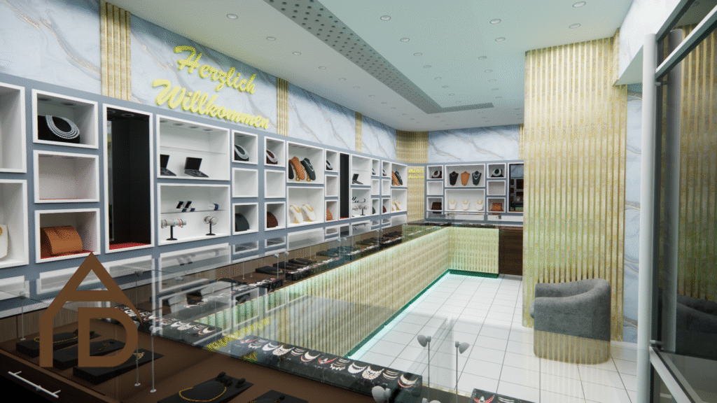 In this modern jewelry store project, we aimed to merge luminous elegance with contemporary sophistication. Bright, marble-patterned walls dominate the space, creating a refined balance with the warm, golden vertical panels. The design’s most captivating feature—the custom-built, illuminated display system—brings a sense of clarity and focus, forging a welcoming yet exclusive atmosphere that allows the jewelry to truly shine.