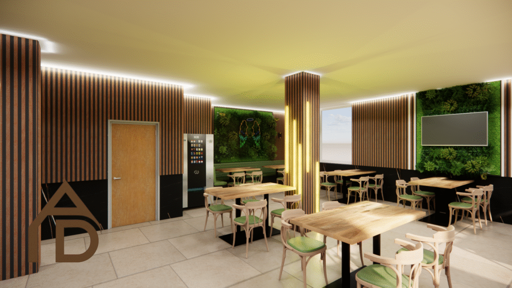 For this restaurant space, the goal was to blend functionality with a strong, nature-inspired aesthetic. The architectural rhythm of dark wood slats, accented with vertical lighting, provides a sophisticated structure. This is softened by large panels of preserved greenery, bringing an organic touch indoors. Light wood furniture with green accents complements the overall theme, creating a stylish yet comfortable environment that elevates the everyday break-time experience.