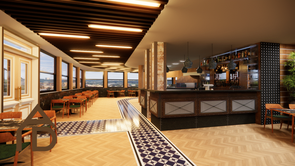 For this unique restaurant and bar, the design concept centers on creating distinct zones and guiding the guest experience. A beautiful herringbone wood floor provides warmth, while a central runner of intricate blue-and-white tile creates an elegant path toward the bar. The material palette is rich and varied, from the industrial-inspired bar front to the classic brick pillars and the dark, slatted ceiling. Large, curved windows frame the view, making the city a dynamic backdrop for a memorable dining experience.
