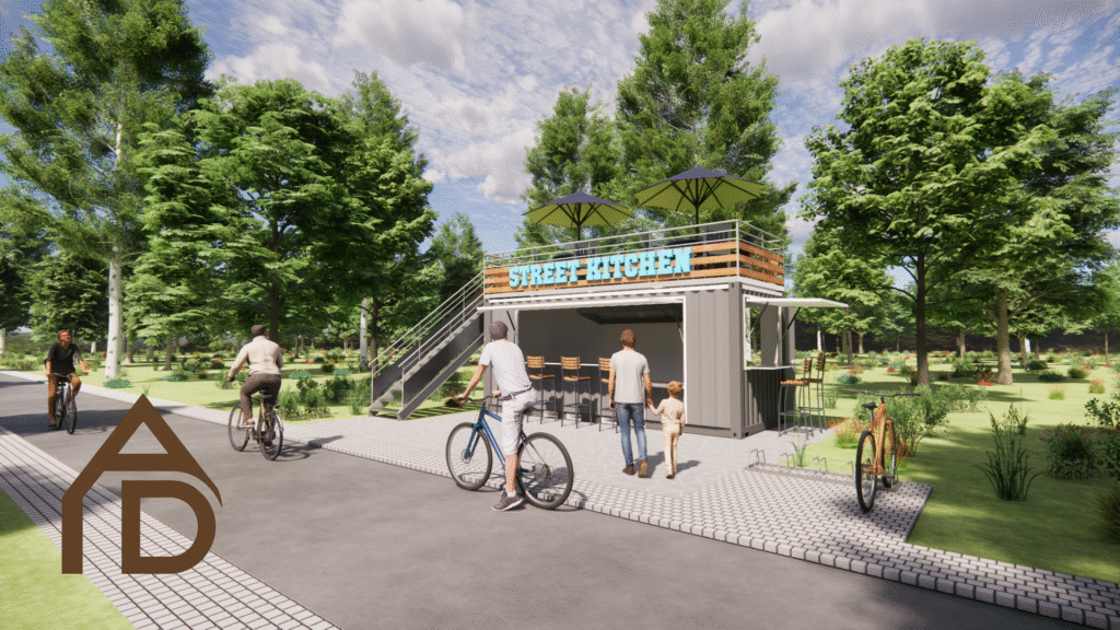 This project reimagines the park food kiosk by transforming a simple shipping container into a multi-level destination. The ground floor houses the functional kitchen and service area, while an external staircase leads to a spacious wooden deck on the roof, effectively doubling the usable space. The design’s raw, industrial aesthetic is softened by its seamless integration into the natural landscape, making it a modern and practical addition to this public recreational area.