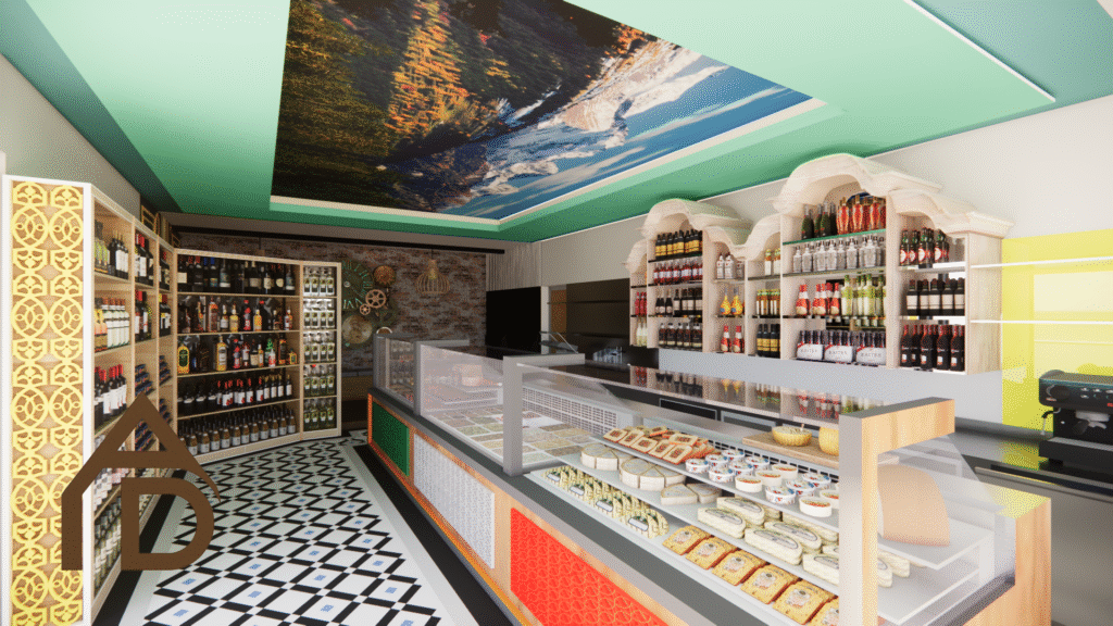 This sophisticated delicatessen design offers a contemporary vision of a classic European gourmet market, defined by its immersive ceiling feature, a rich interplay of materials, and bold geometric patterns. The central feature is a stunning, full-scale landscape mural recessed into the ceiling, which is framed by a vibrant mint-green soffit. This dramatic, sky-like element immediately sets a unique and transportive tone for the space. This creative vision is anchored by the long refrigerated counter below, proudly clad in the green, white, and red of the Italian flag, creating a welcoming and patriotic focal point for customers.