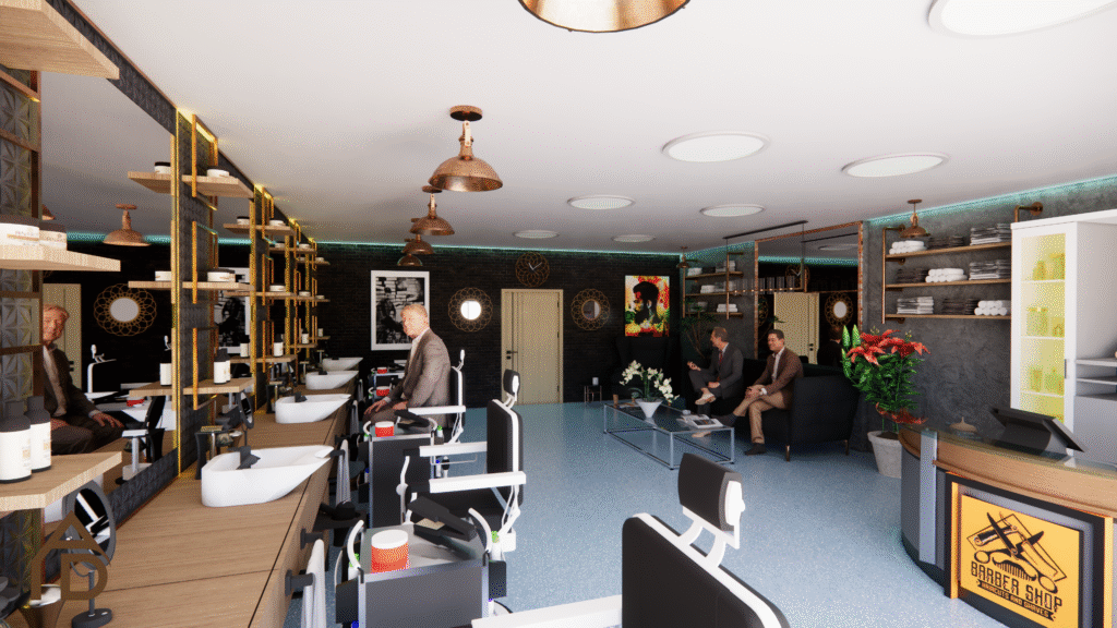 This dynamic barbershop design offers a contemporary reinterpretation of the classic gentlemen’s grooming club, defined by its sophisticated use of layered lighting, a rich mix of textures, and warm metallic accents. The central feature is the striking row of individual barber stations, each framed in elegant copper-toned metal against a dark, textured wall. This structured, industrial-luxe setup is warmly complemented by vintage-style pendant lamps that cast a focused glow on each chair, creating an intimate and premium experience for every client.
