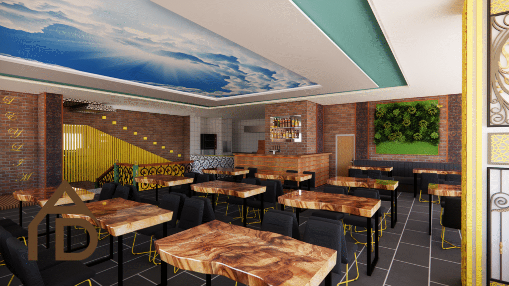 This dynamic restaurant design offers a bold fusion of natural and industrial aesthetics, defined by its dramatic ceiling feature, a tactile mix of textures, and an energetic use of accent color. The central feature is the striking interplay between the earthy, high-gloss live-edge wood tabletops and the open, airy sky mural illuminated on the ceiling. This powerful “earth and sky” contrast creates a unique and immersive dining atmosphere, grounding guests with the rich wood grain while simultaneously drawing the eye upward.