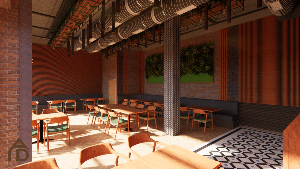 In this modern restaurant project, we aimed to merge the warmth of nature with urban sophistication. Rich wood textures dominate the space, creating a refined balance with the noble black marble that clads the bar. The design’s most captivating feature—the vertical gardens—brings a breath of fresh air, forging an inviting atmosphere that feels deeply connected to nature.