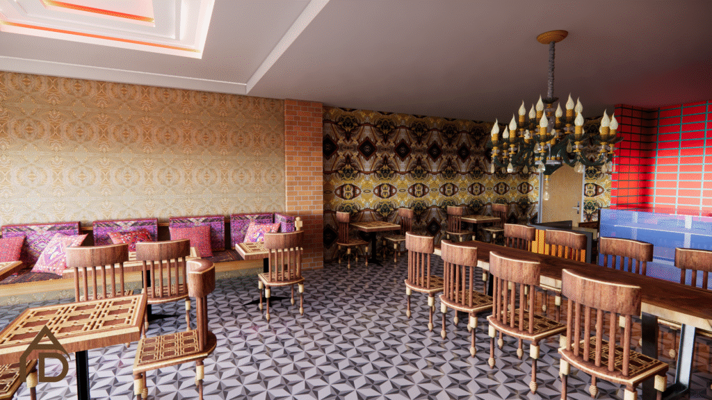 This immersive restaurant design offers an authentic interpretation of a traditional dining hall, defined by its rich layering of intricate patterns, opulent textiles, and ornate, handcrafted furniture. The central feature is the collection of bespoke wooden tables and chairs, each piece detailed with elaborate turned-wood spindles and decorative inlay work. This celebration of traditional craftsmanship provides a strong, tangible sense of authenticity that is beautifully complemented by the complex patterns of the surrounding floor tiles and wallpaper.