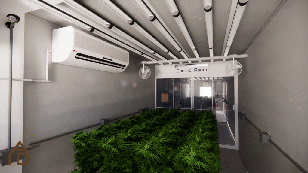 This highly functional design showcases a state-of-the-art indoor cultivation ecosystem, defined by its powerful array of specialized lighting, integrated climate control systems, and the vibrant plant life it sustains. The central feature is the ceiling’s extensive grid of linear grow lights, which bathes the room in a bright, uniform light engineered for vigorous growth. This technological canopy acts as an artificial sun, powering the dense sea of green below and creating a perfect synthesis of technology and horticulture.